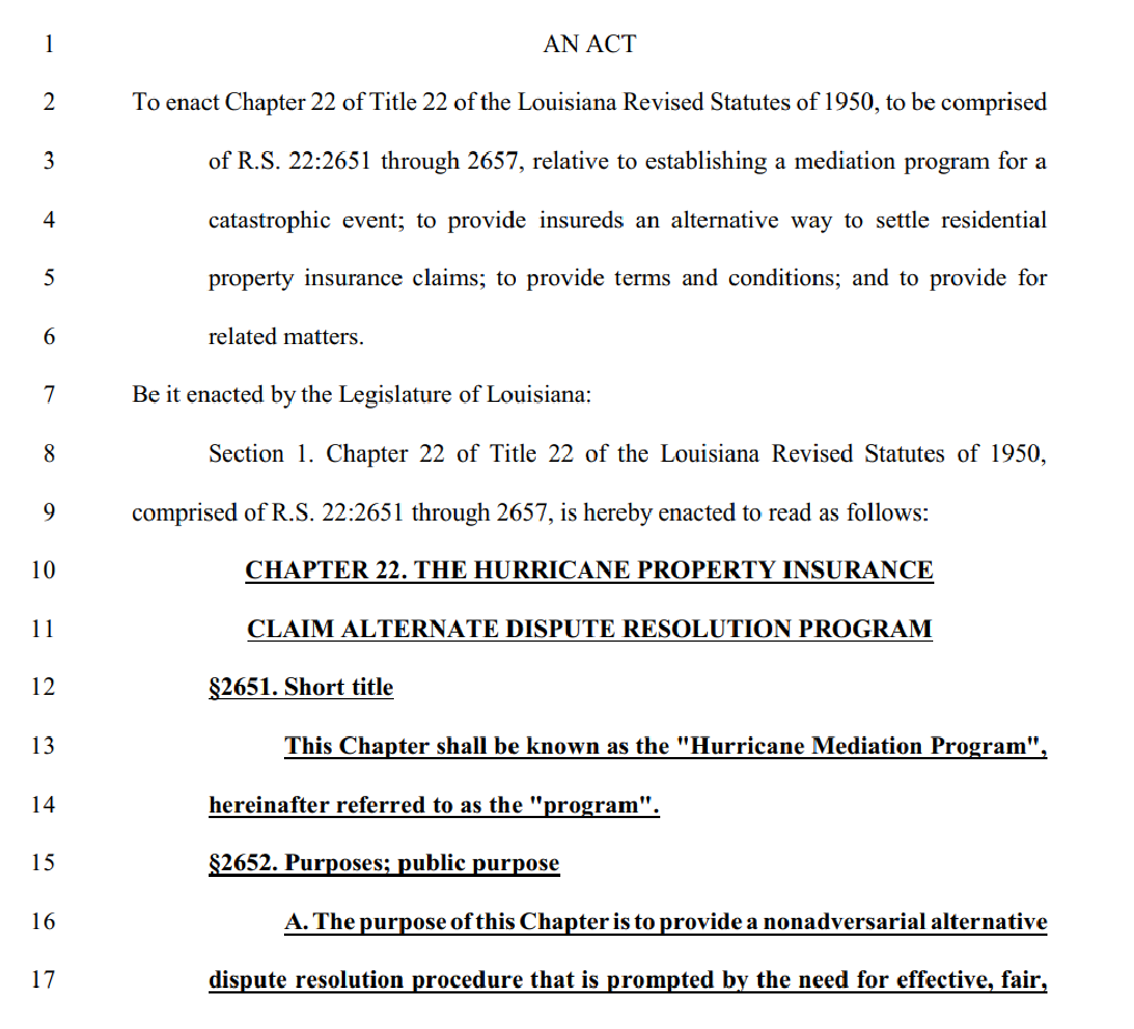 In 2023, a Louisiana law created the Hurricane Mediation Program to timely handle residential property insurance claims.